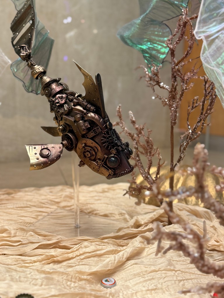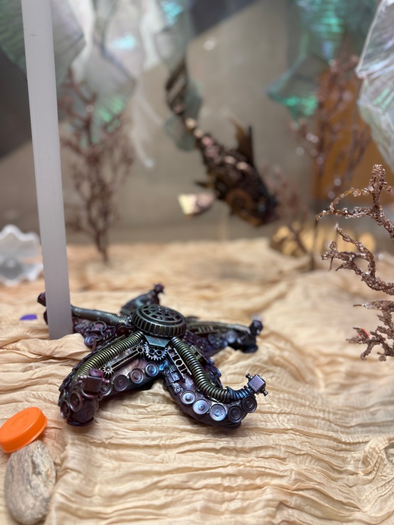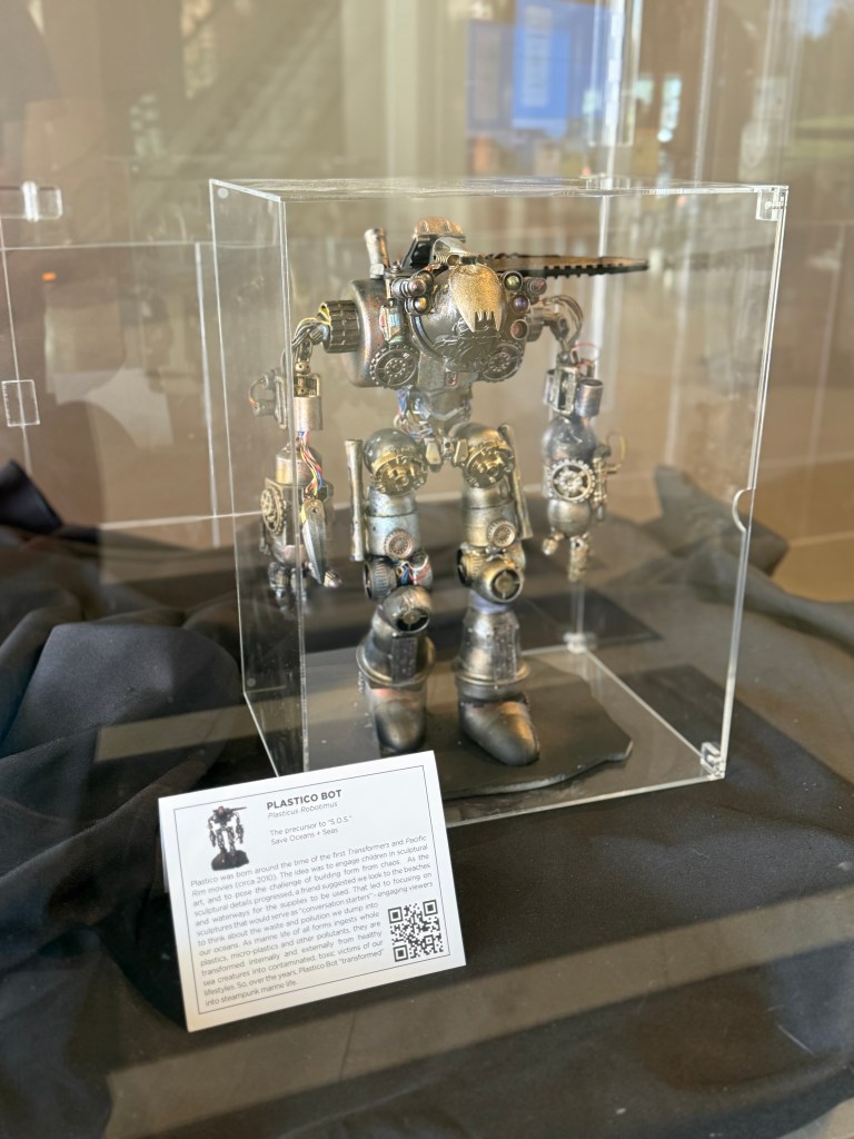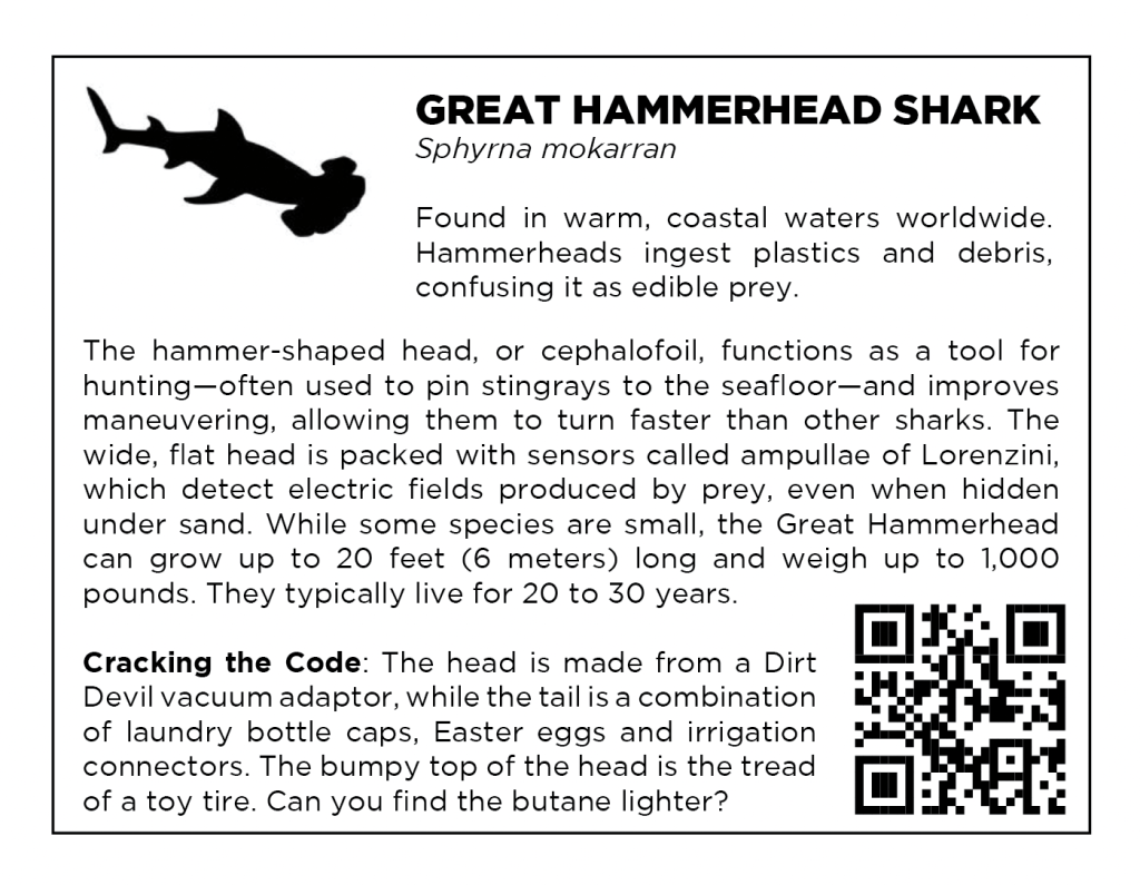 The collection features an array of marine life meant to serve as a Conversation Starter… the topic: “SAVE OCEANS + SEAS” or “S.O.S.” Each work of art is meticulously designed and crafted using an array of discarded materials washing into our vast oceans and waterways. As we pollute the planet, our defenseless neighbors absorb the trash as it breaks down in the form of microplastics and indigestible debris.