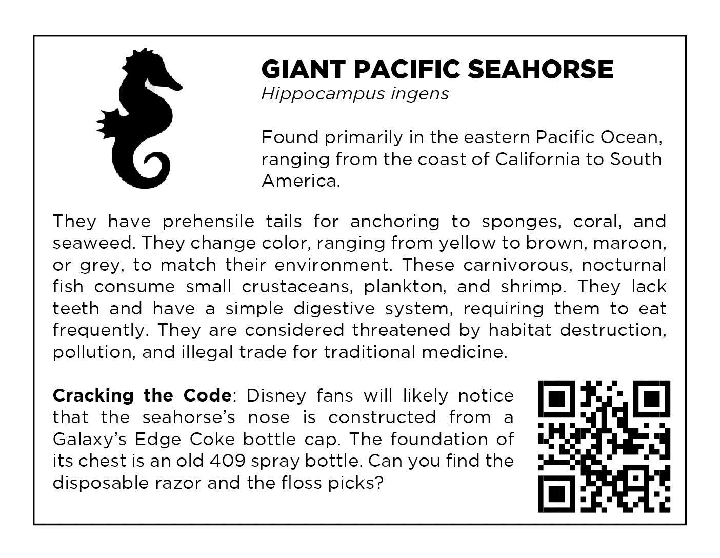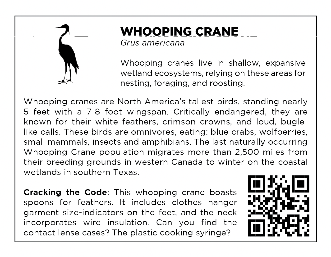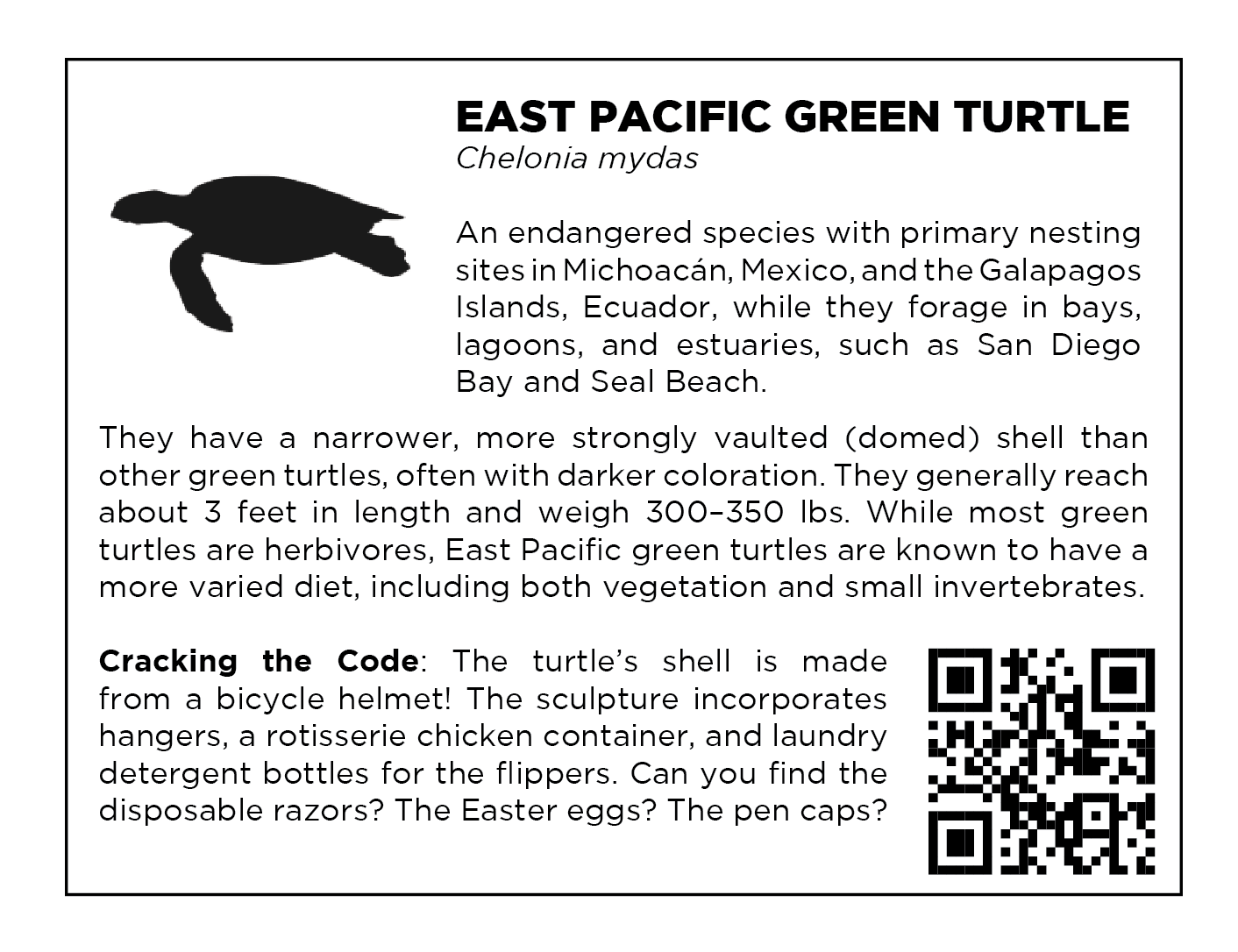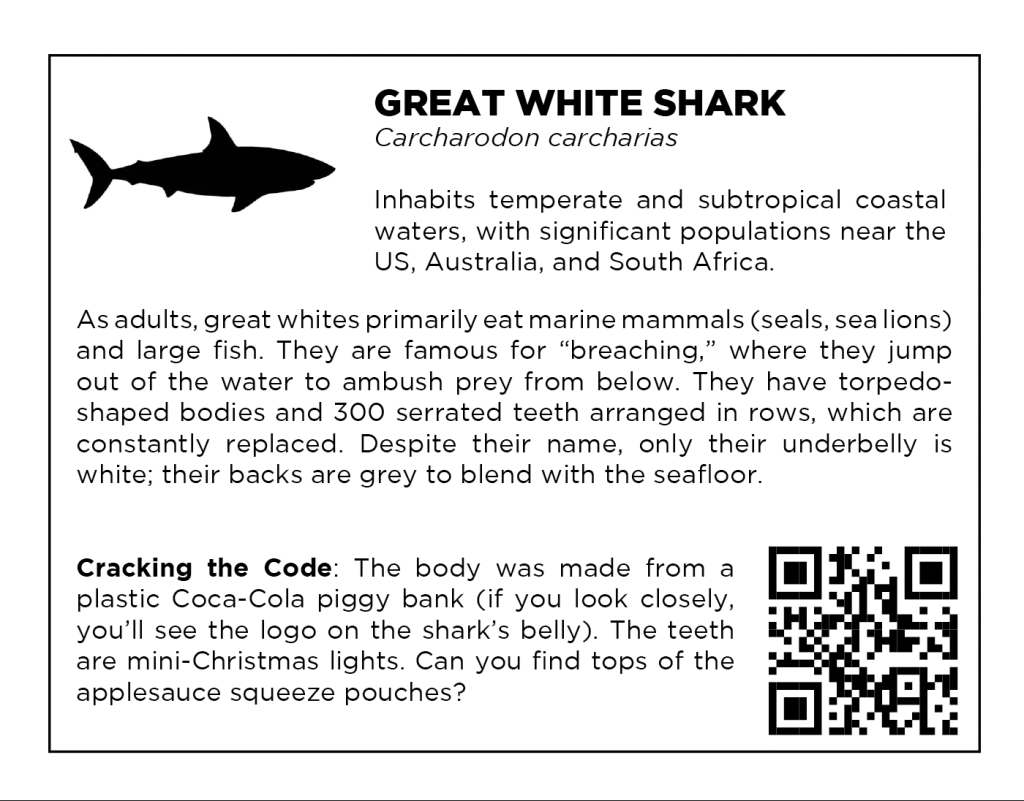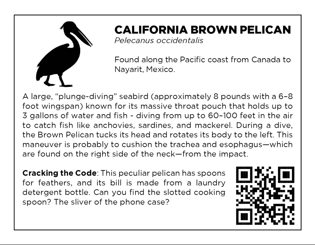 Study each work and see if you can break the code. What pieces of trash have been incorporated into the body of each animal? How can we help save these actual animals from a fate of being poisoned by our debris?